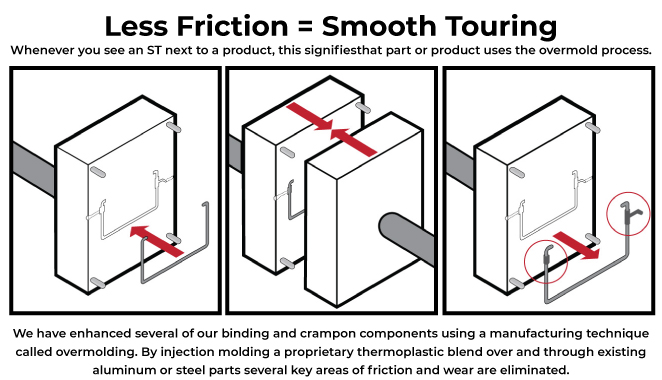 Solid baseplate design, stiffer Asym Rip ‘N’ Flip Highbacks, and more supportive Pillow Line Ankle Straps combine to give riders greater control in demanding terrain. All Surge ST bindings incorporate our industry-leading Tesla T1 technology. Our Smooth Touring (ST) Tech is featured on our ST Brackets and ST Whammy Bars. These components utilize a proprietary thermoplastic blend that is molded over the metal part reducing friction, increasing durability, and improving touring efficiency.